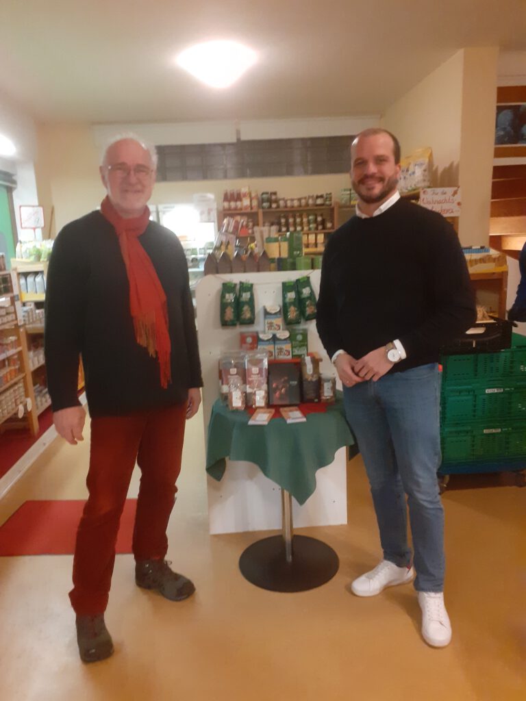 Bevor Jan-Peter Röderer, Landtagsabgeordneter der SPD für den Wahlkreis Sinsheim, die Veranstaltung „Demokratie.Stark.Machen.“ im Clubhaus des TSV eröffnete, schaute er im Naturkost- und Weltladen Löwenzahn vorbei, um sich mit Herbert Hauck über die Arbeit der Naturfreunde in Neckarbischofsheim und auf dem Zwingenberger Hof auszutauschen. Den Zwingenberger Hof kennt Röderer von Kindesbeinen an, da er schon mit seinen Eltern regelmäßig dort zu Gast war.
